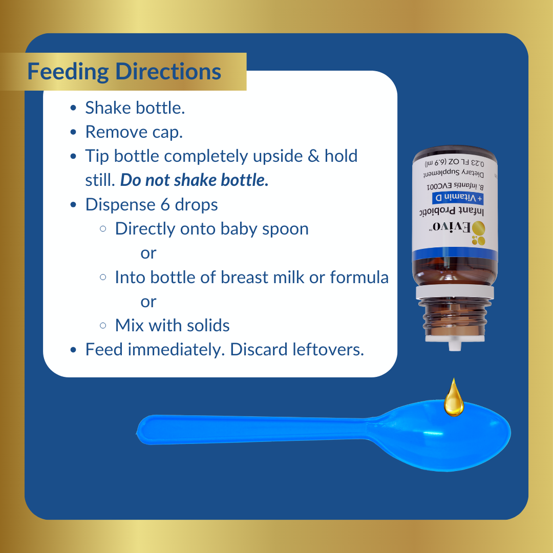 Directions: Shake bottle VIGOROUSLY with cap on, tip bottle upside down and HOLD STILL - do not shake drops out - wait until 6 drops slowly drip onto baby spoon or into bottle. Watch instruction video for administering drops here: https://www.evivo.com/parents/, under "Feeding & Storage".